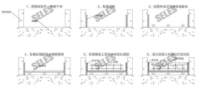 ● 浮筑地臺上設備或其他建筑構件不能與其他周邊建筑物等有直接剛性接觸,以防振動傳遞。