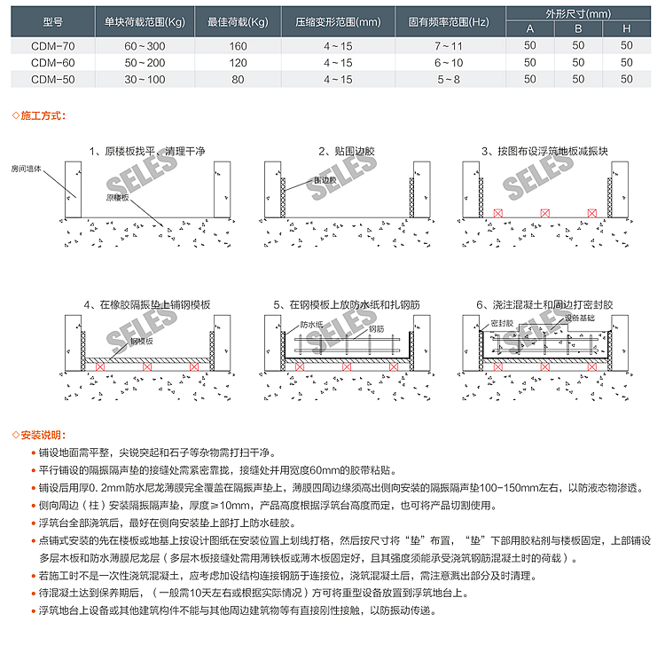 ● 側向周邊(柱)安裝隔振隔聲墊,厚度≥10mm,產品高度根據浮筑臺高度而定,也可將產品切割使用。